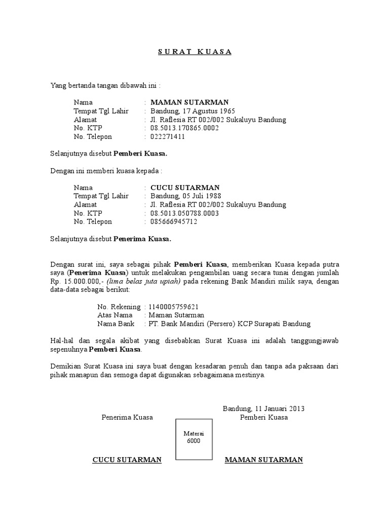 Jakarta,10 agustus 2009 penerima kuasa pemberi kuasa materai 6000 <nama pembawa surat> <nama pemilik rekening> www.kisahkamu.com www.kisahkamu.com contoh surat kuasa pengambilan uang di bank ke 2 surat kuasa yang bertanda tangan dibawah ini : Contoh surat kuasa pengambilan uang di bank. Berikut contoh surat kuasa ini dalam format ms. Pengambilan uang di bank bni yang melibatkan penerima kuasa harus didukung oleh surat kuasa yang sah. Pengambilan uang dibank tidak bisa sembarangan terlebih nama rekening tersebut bukan atas nama kita.